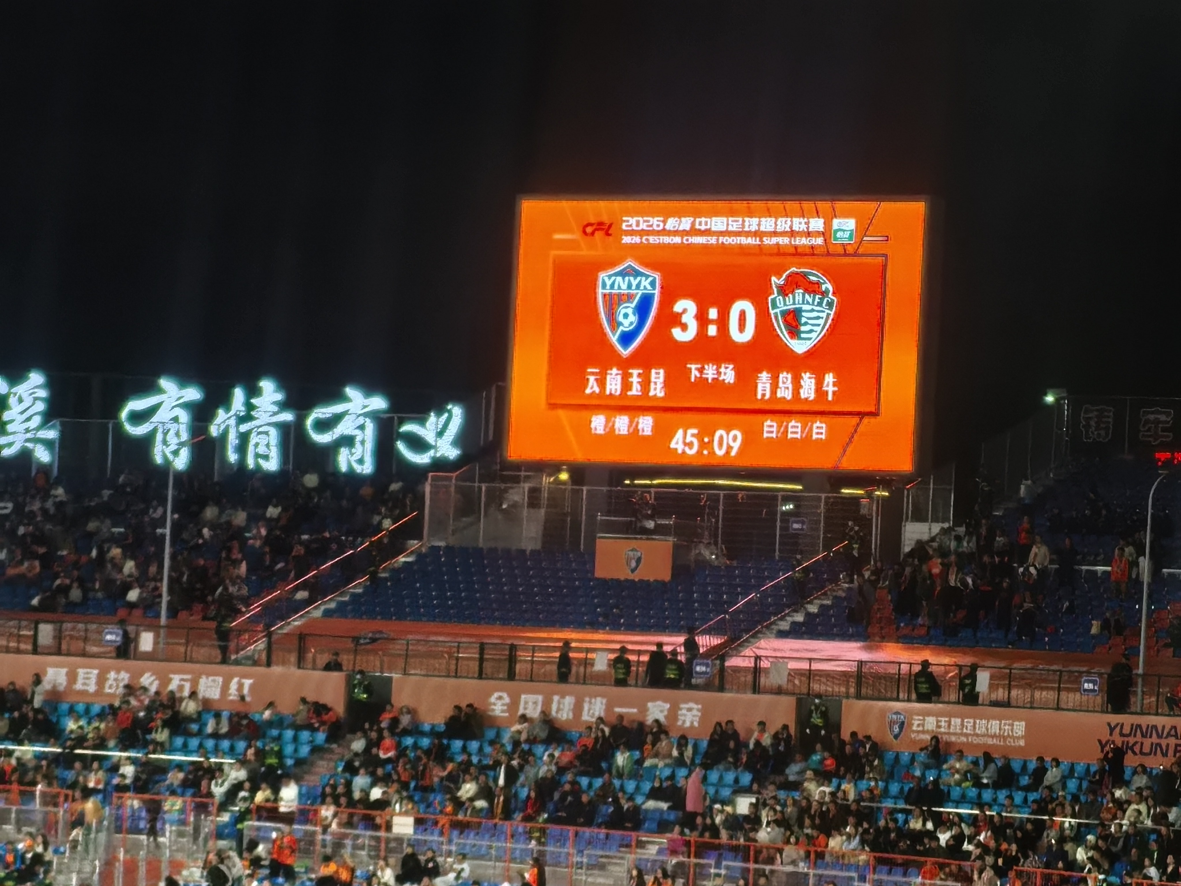 随着这粒进球,上半场比赛结束,场上比分定格在3:0,云南玉昆队带着3球的巨大优势暂时领先青岛海牛。