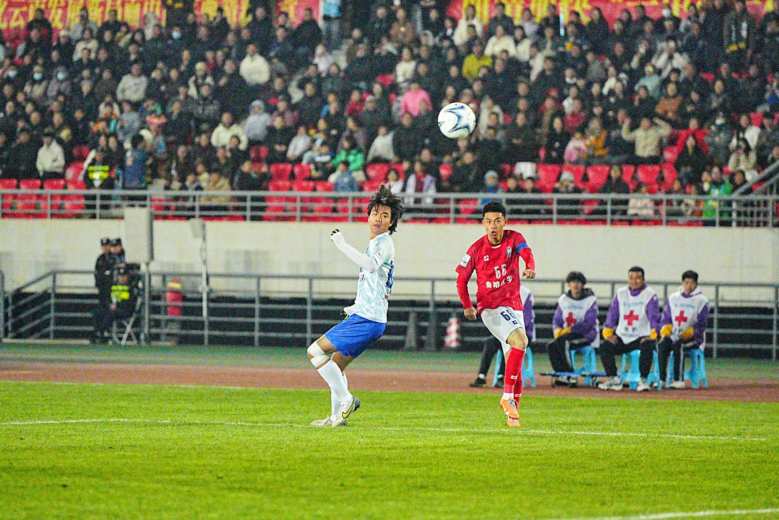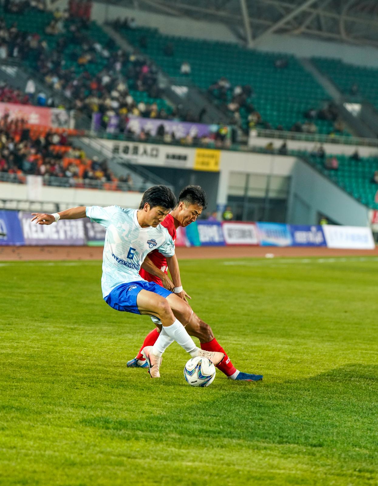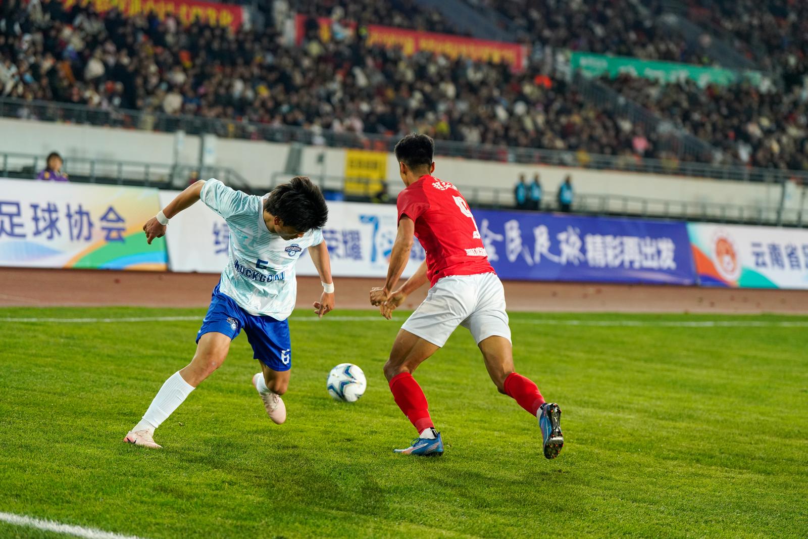僵局在第16分钟被打破,云南爨合队在前场打出精妙配合,10号队员和董董接队友赵奕豪的传球,以一记有力的头球攻门,足球应声入网,体育场瞬间被点燃,主场球迷爆发出欢呼声。领先后的云南爨合队攻势不减,客场作战的广州悦高队也耐心组织,伺机反击。上半场临近尾声,第44分钟,广州悦高队88号球员尤沛铭头球破门,上半场比分扳平为1:1,两队带着平局进入中场休息。
