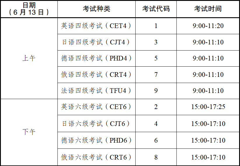 (二)笔试:6月13日,开考科目为英语四级和六级,日语、德语、俄语3个语种的四级和六级以及法语四级。