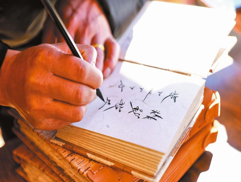 非遗代表性传承人在东巴纸笔记本上为游客手写东巴语祝福。记者 胡妤雅 摄