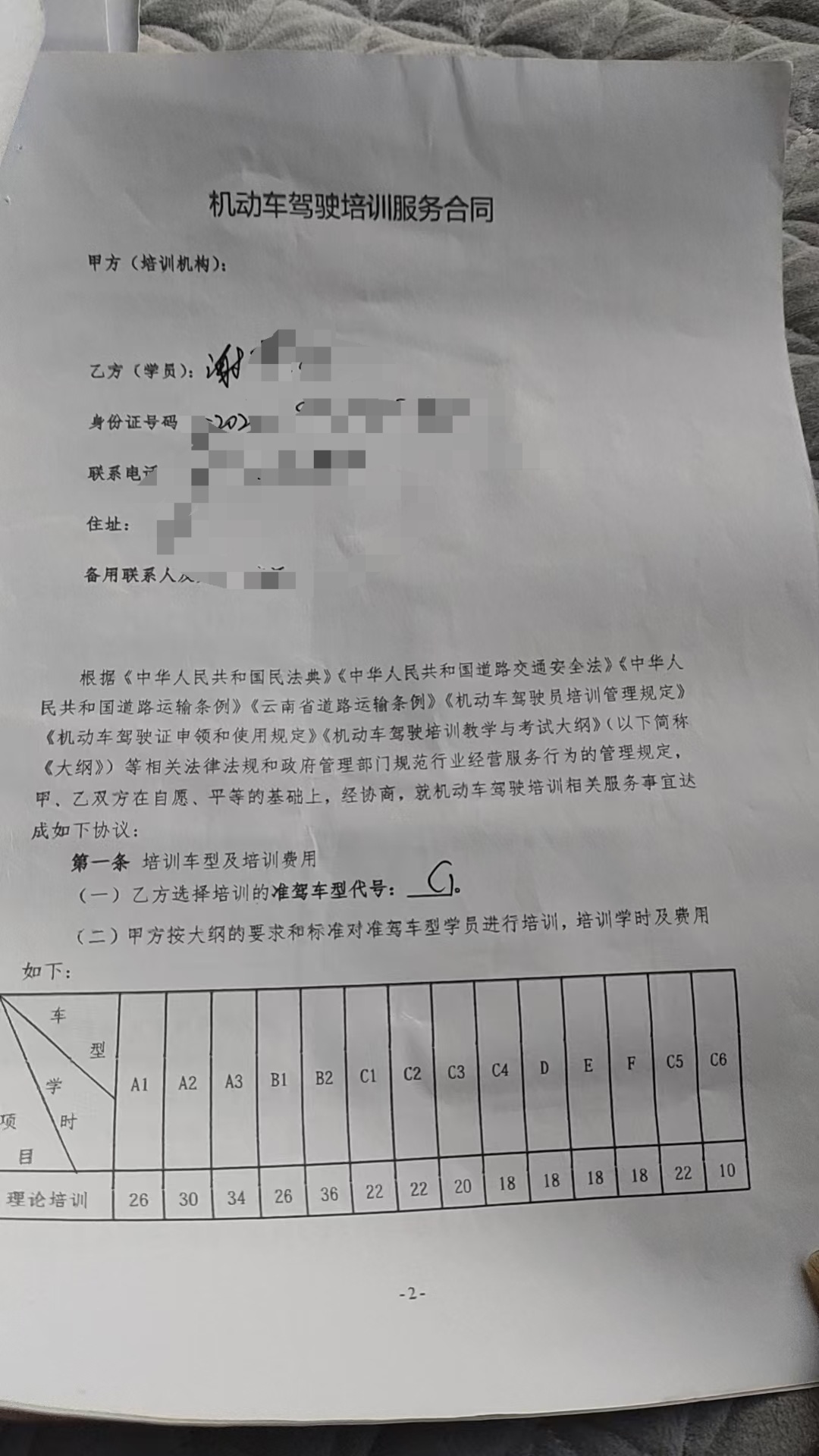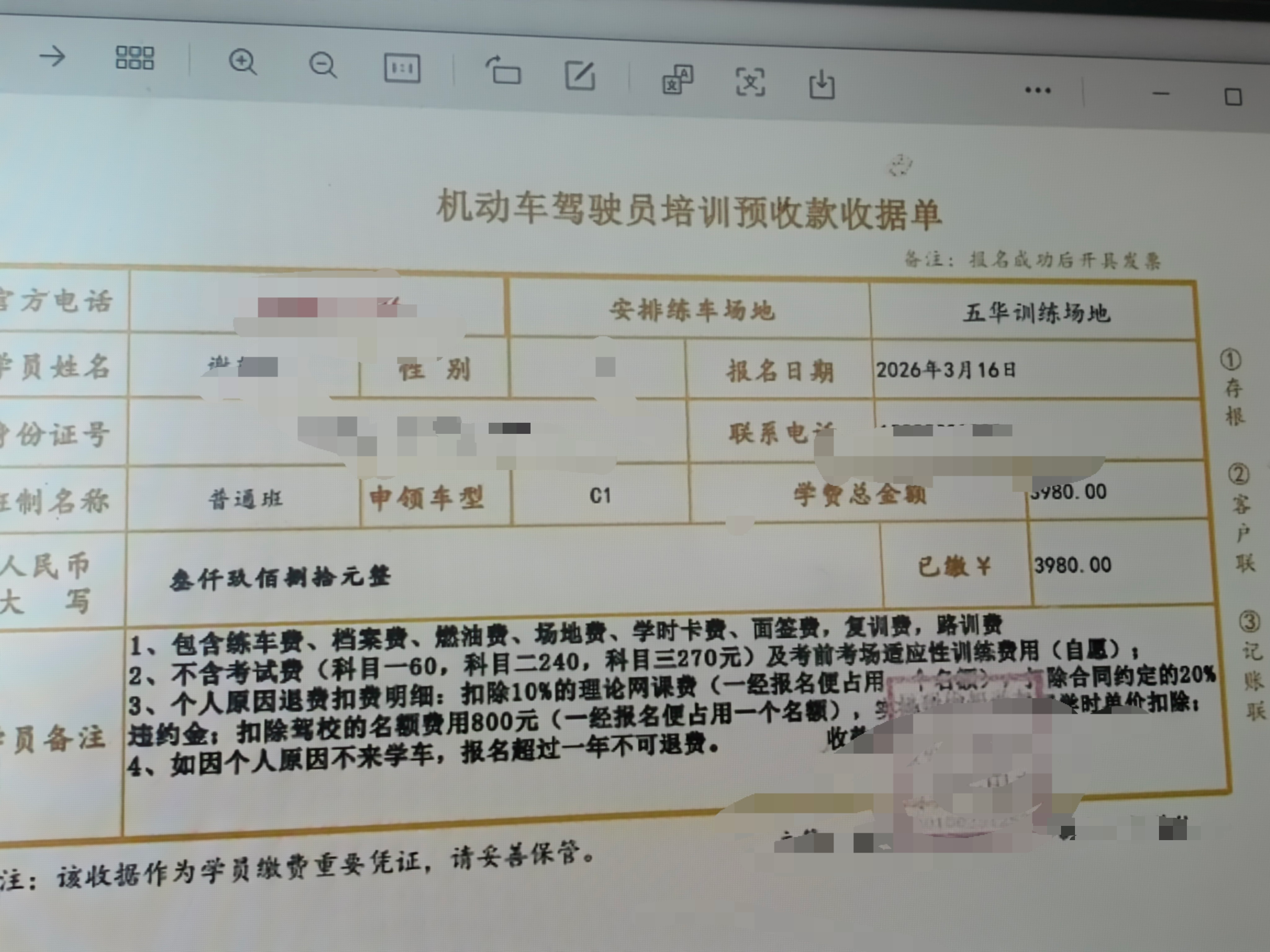 在谢女士提供的一份《机动车驾驶培训服务合同》中,记者看到甲方一栏为空白,仅有谢女士的乙方信息。她选择的培训准驾车型代号为C1,培训总费用3980元,合同服务期为1年,签订日期为2026年3月16日。