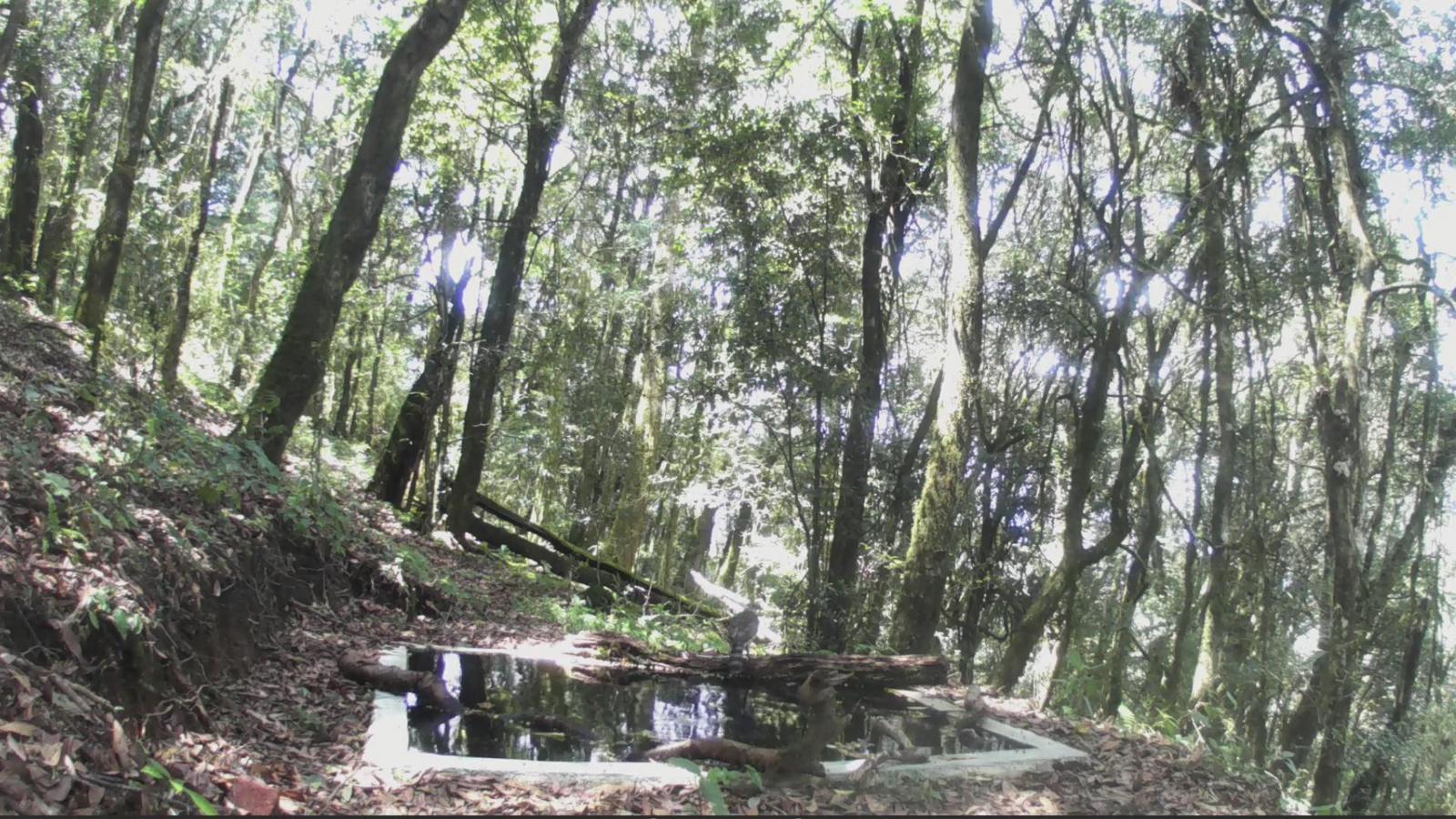 在这段珍贵的监测影像中,一只苍鹰飞落在保护区内专为野生动物搭建的补水池旁边的枯木上。它先是静静望向茂密森林,片刻后慢慢转过身来,机警地抬头环顾四周,锐利的目光扫视周边环境,看似正准备前往水池饮水,一举一动尽显猛禽的警觉与矫健。