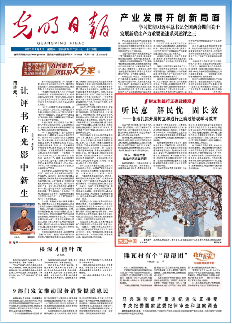 4月4日,光明日报头版刊登题为《听民意解民忧固长效》的文章,报道重庆、海南、云南、陕西等地扎实开展树立和践行正确政绩观学习教育的做法。