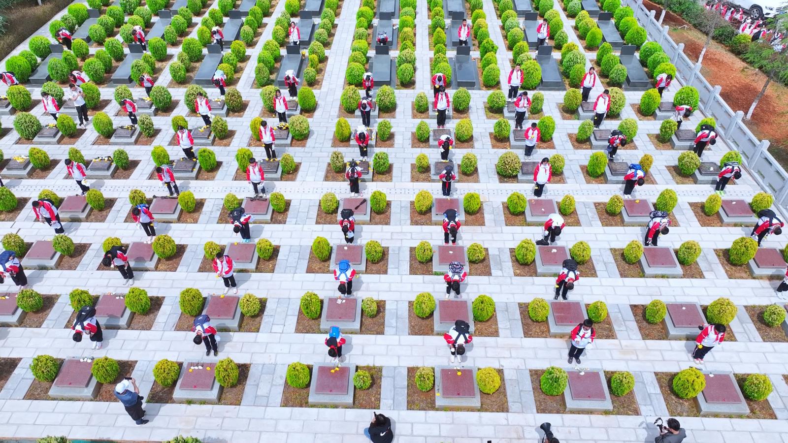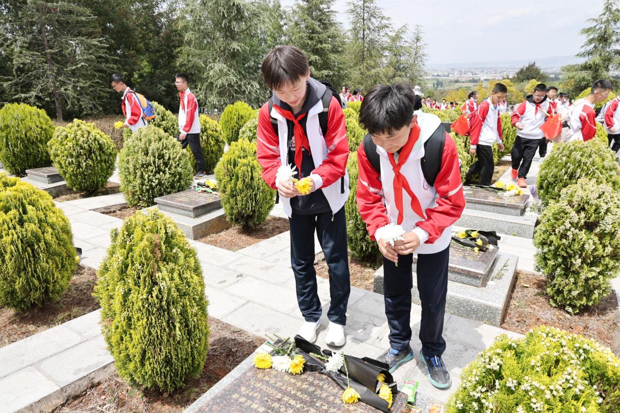 缅怀仪式上,全体师生整齐肃立,奏唱中华人民共和国国歌。随后,全体人员低头默哀1分钟,学生代表手捧花篮,缓步走向烈士纪念碑,郑重敬献花篮,表达对先烈的崇高敬意;全体少先队员重温入队誓词,铿锵誓言回荡陵园;各班同学依次上前,向革命烈士纪念碑敬献鲜花、擦拭墓碑、鞠躬致敬,将追思与敬仰化作无声的行动。