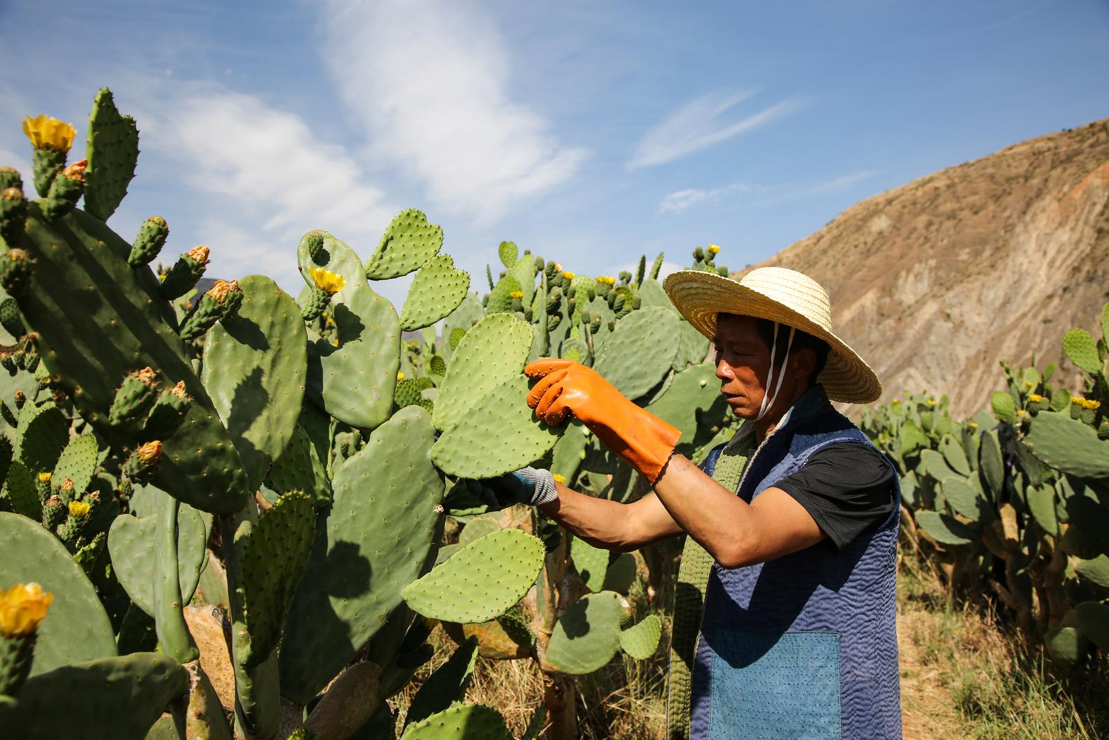 走进会泽县以礼街道温泉村,放眼望去,山坡上并非沃土良田,而是漫山遍野的沙石。在这片干热贫瘠、草都难长旺的土地上,一株株排列整齐的仙人掌却顽强生长,绿意盎然。