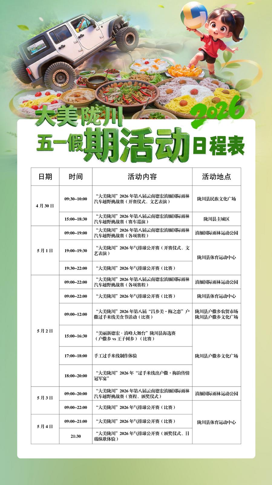 据了解,陇川县深度挖掘雨林生态、民族文化与边境文旅资源,精心策划了“大美陇川”2026年五一假期系列活动,将体育竞技、特色美食、民族文艺完美融合,四大精彩活动轮番上演,承包你整个假期的快乐!