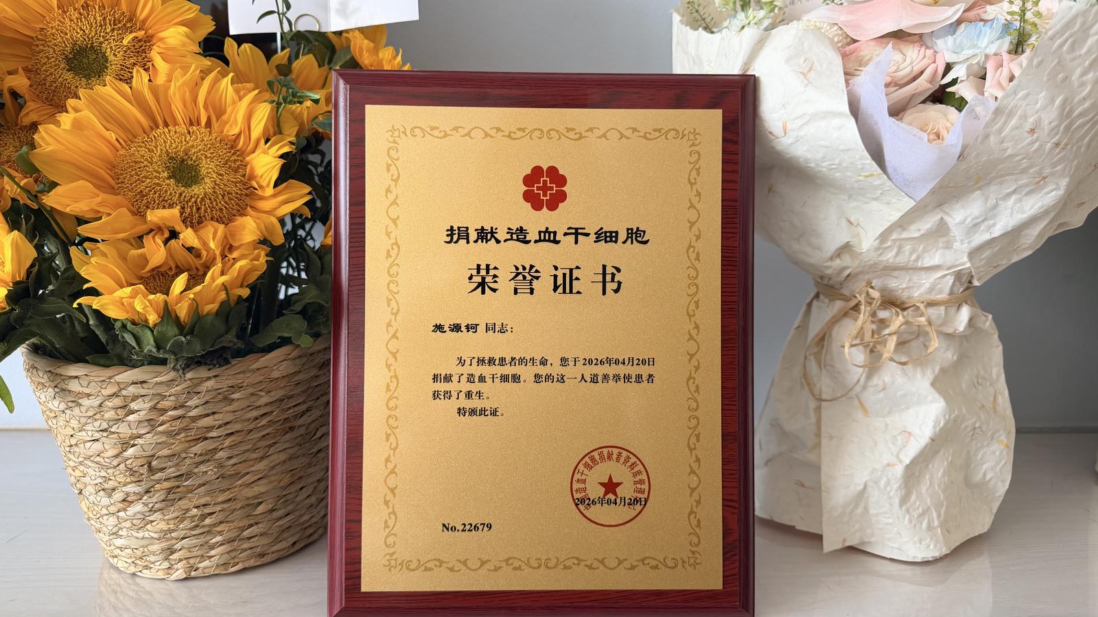 4月20日,27岁的施源钶顺利完成外周血造血干细胞采集,为一名7岁血液病患儿点亮重生希望。
