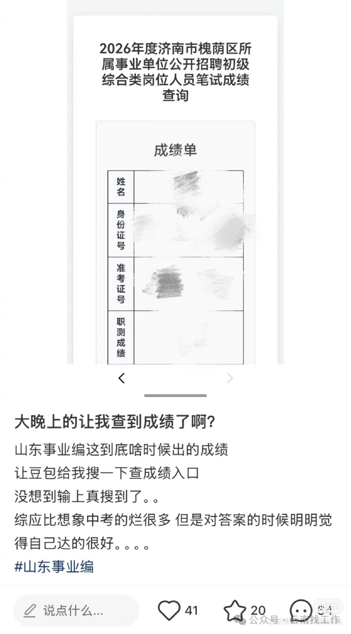 4月23日晚,有网友发帖称,“豆包查到2026山东事业编成绩了”,并附上一张成绩单,但成绩部分涂掉了。“不过好像只有津南槐荫区的能查,是不是属实咱也不知道,到底啥情况呀?”4月24日,扬子晚报记者联系上该网友了解到,帖子内容来自其他网友,但目前原帖网友已经删除了帖子。